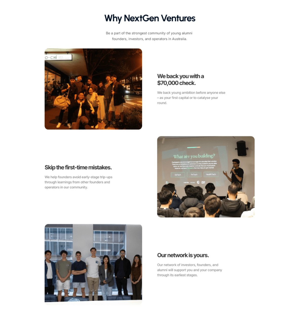 NextGen Ventures is Australia’s first student-focused VC fund, for students, by students. Their mission is to back the next generation of ambitious founders with capital, community, and cultural change.